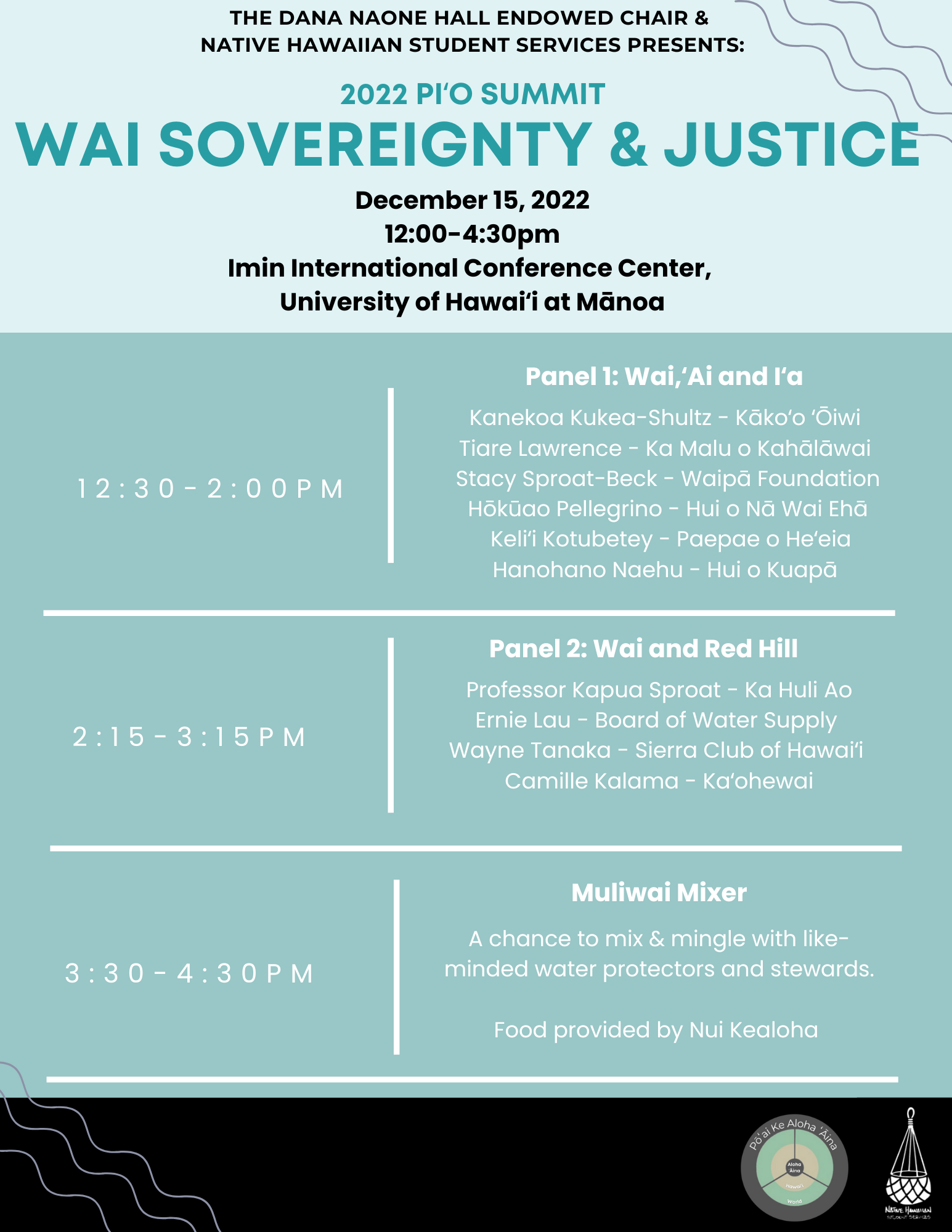Wai Sovereignty & Justice was chosen as the theme of our inaugural summit to draw attention and action to the current state of our wai, along with the constant threats our water resources are currently facing. Wai Sovereignty & Justice brought together esteemed community leaders, advocates, and truth speakers who are advancing aloha ʻāina and water justice. The summit consisted of two day-time panels, a networking mixer event and an evening keynote discussion.